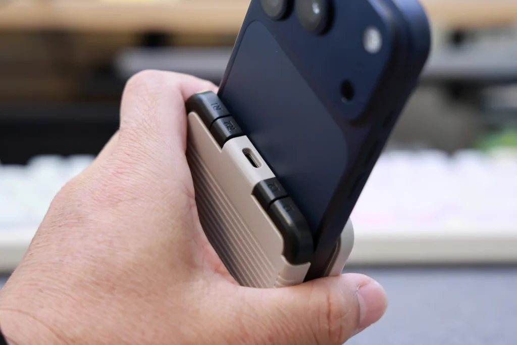 Pocket Tacoの底面はオープン設計になっており、スマホの充電ポートを塞ぎません。LightningケーブルやUSB-Cケーブルを差したまま遊べるため、長時間のプレイでもバッテリー切れを気にせず楽しめます。