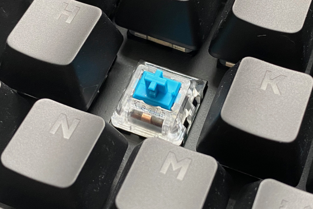 青軸はいわゆる「Cherry MX Blue」を採用。Cherry MX軸はメカニカルスイッチのデファクトスタンダードとも言われるポジションにあり、このメーカーの青軸は評価が高いんです。