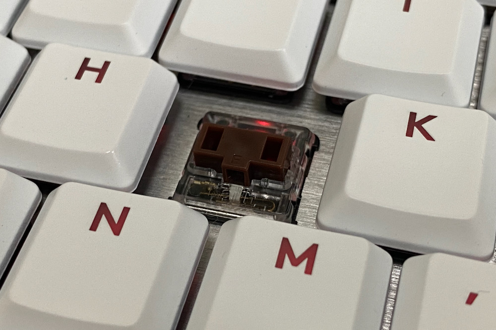 茶軸はというと、その中間です。赤軸に比べると、キーを押下するときに若干の引っかかりがあります。これがカチッという感触と音につながっているんです。