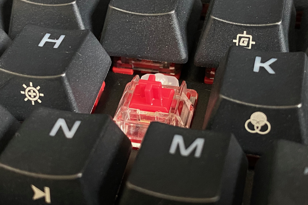 赤軸は、青軸・茶軸など他の基本となるキースイッチと比べると比較的静かです。もちろん、メカニカルキーボードの特性上、キーを押下する際の底打音はします。