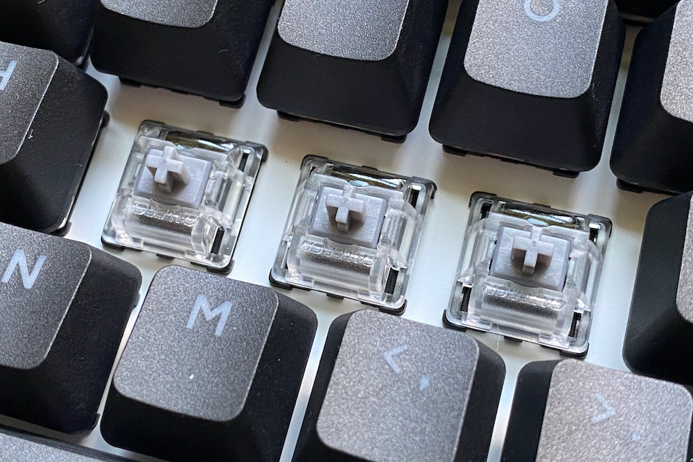 銀軸のクリック感はどちらかというと赤軸に近く、カチッという感触と音はほとんど感じられません。ここに物足りなさを感じる人も、メカニカルユーザーの中にはいます。
