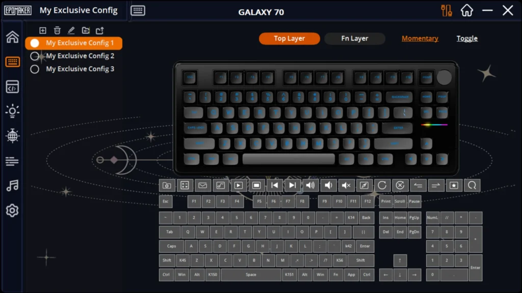 Epomaker Galaxy70は公式サイトで配布されているソフトウェアで、ライティングおよびキーマッピングの設定を行います。