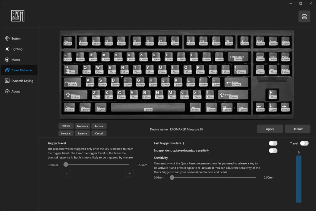 Epomaker Magcore87は、APCとラピッドトリガーに対応しています。