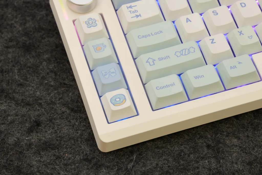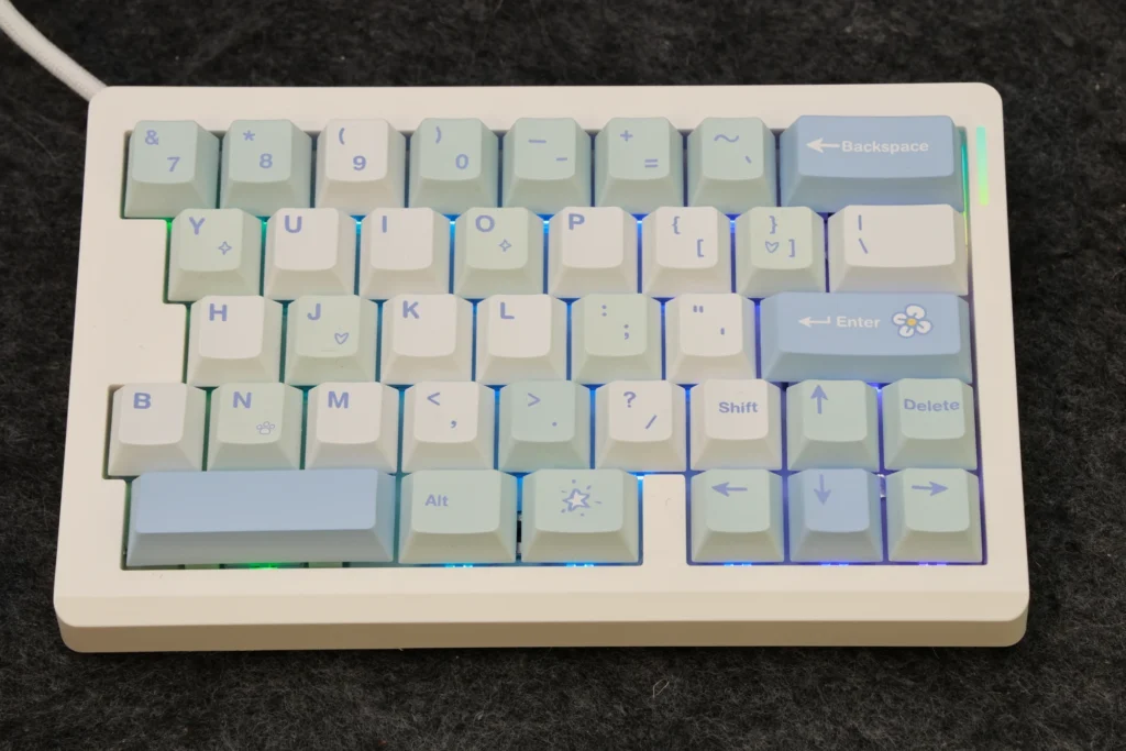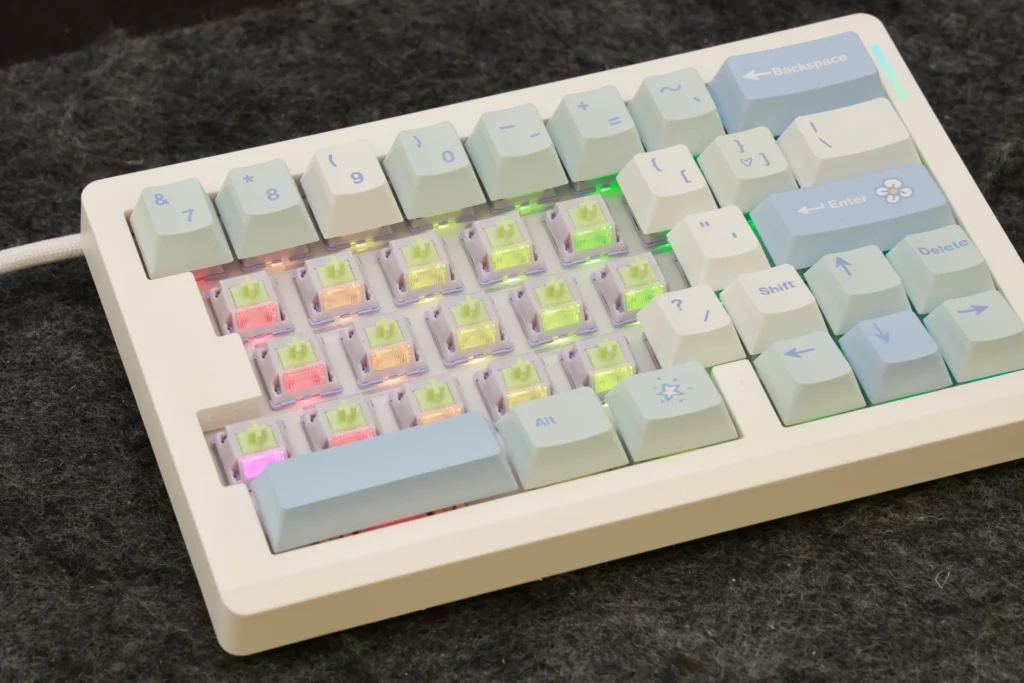 さらに、Epomaker Split70にはホワイトブルーモデルが追加されており、色の選択肢があるのが良いところです。ホワイトブルーモデルは白と青系の色に統一されているものの、3色が散りばめられており、カラフルな印象があります。