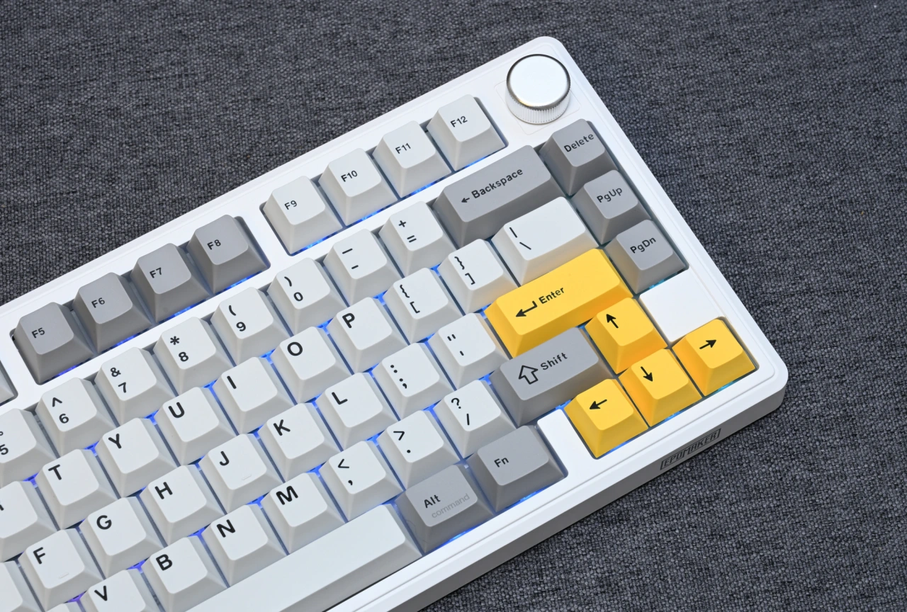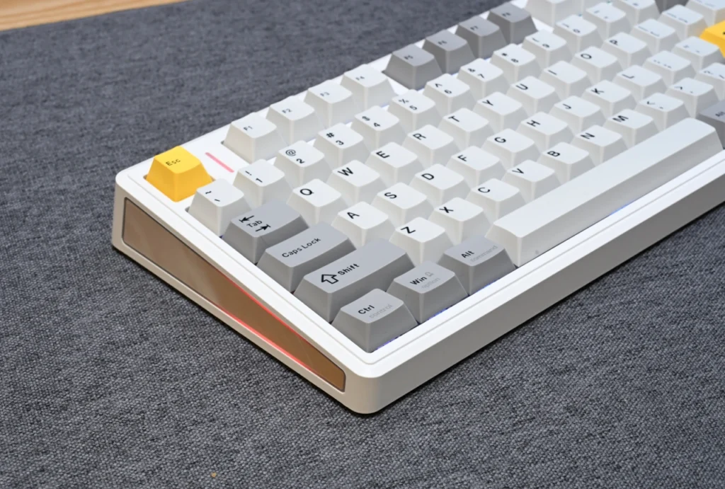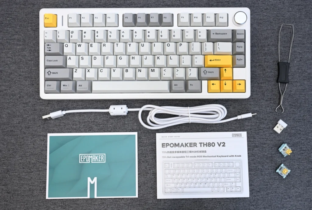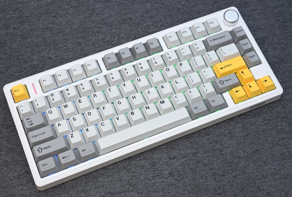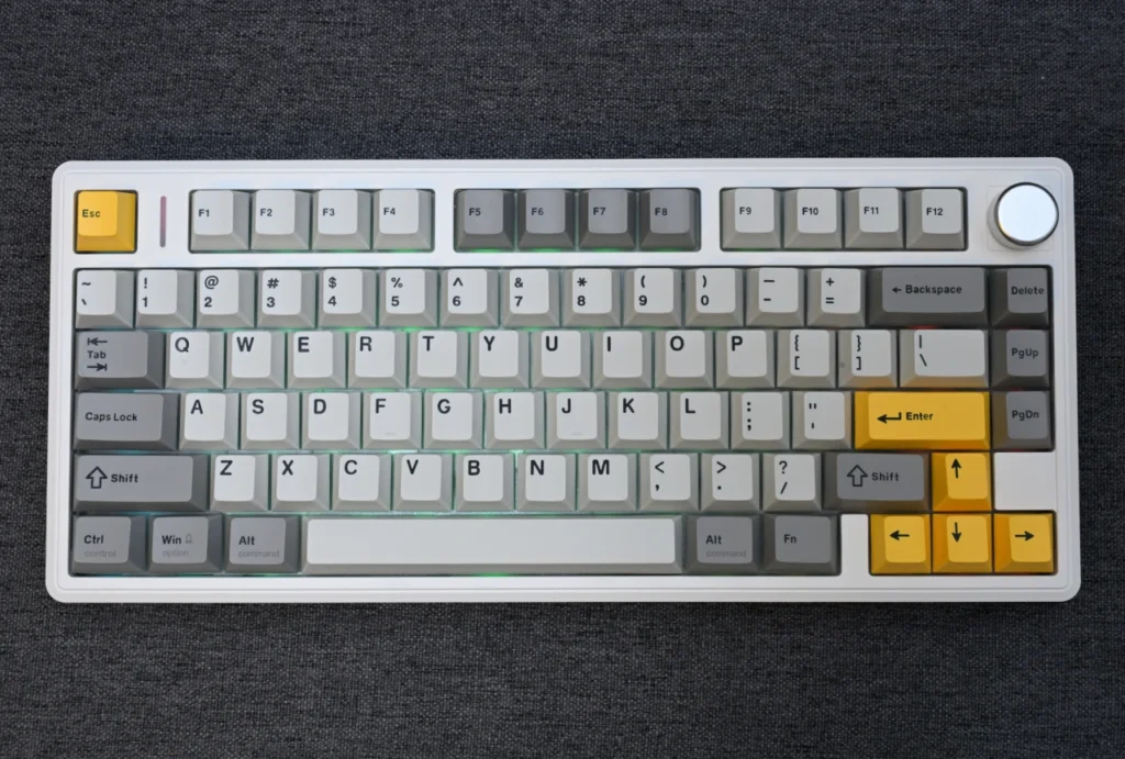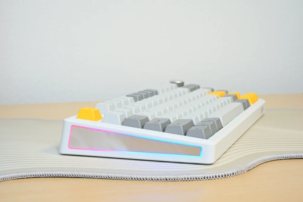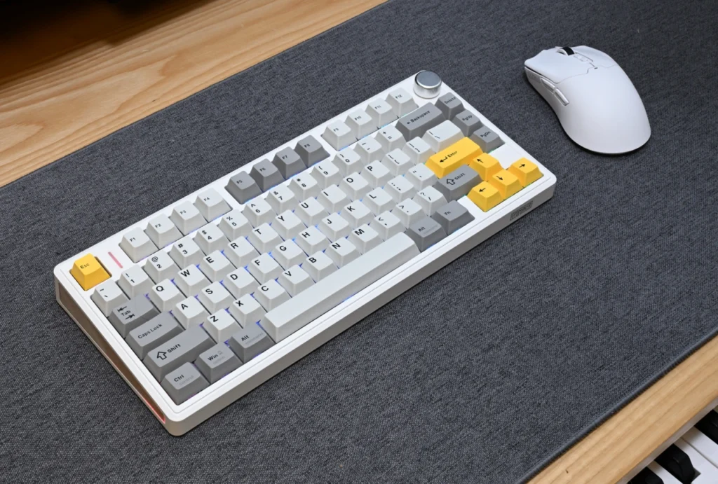EPOMAKER TH80 V2はホワイト筐体に、ライトグレー・ダークグレー・ホワイトのキーキャップを配置し、Esc・Enter・矢印キーにイエローを差し色として置いた配色のキーボードです。