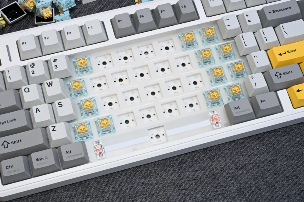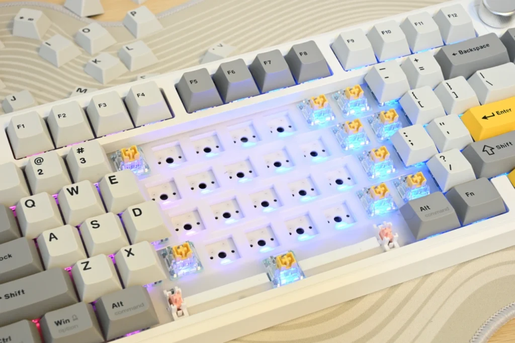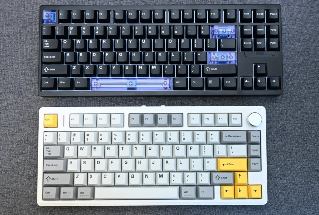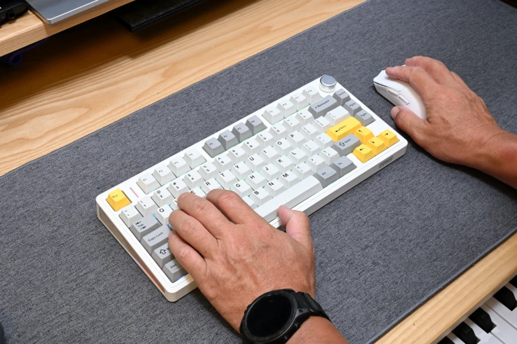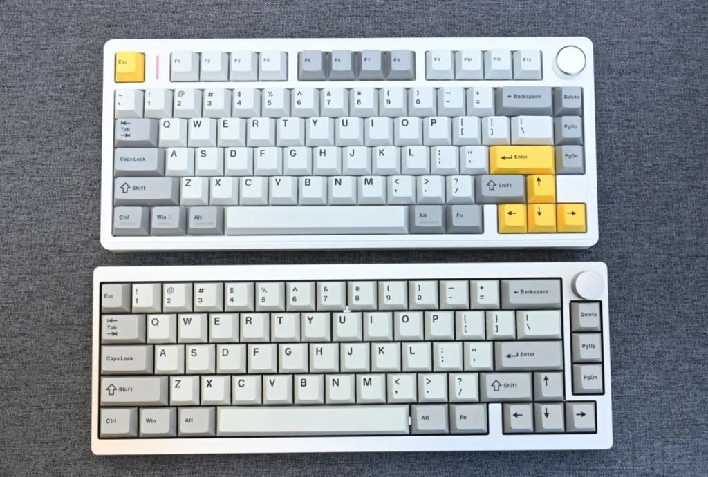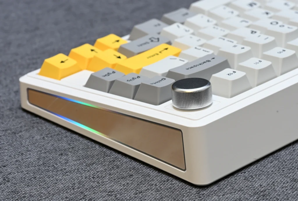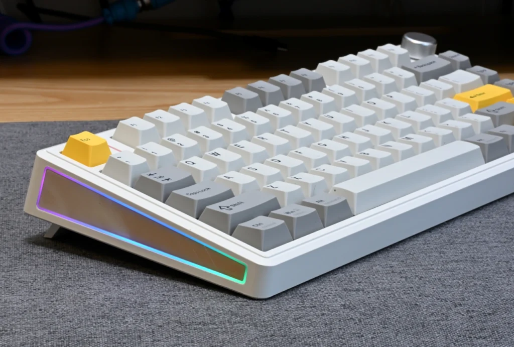 EPOMAKER TH80 V2はホワイト筐体に、ライトグレー・ダークグレー・ホワイトのキーキャップを配置し、Esc・Enter・矢印キーにイエローを差し色として置いた配色のキーボードです。