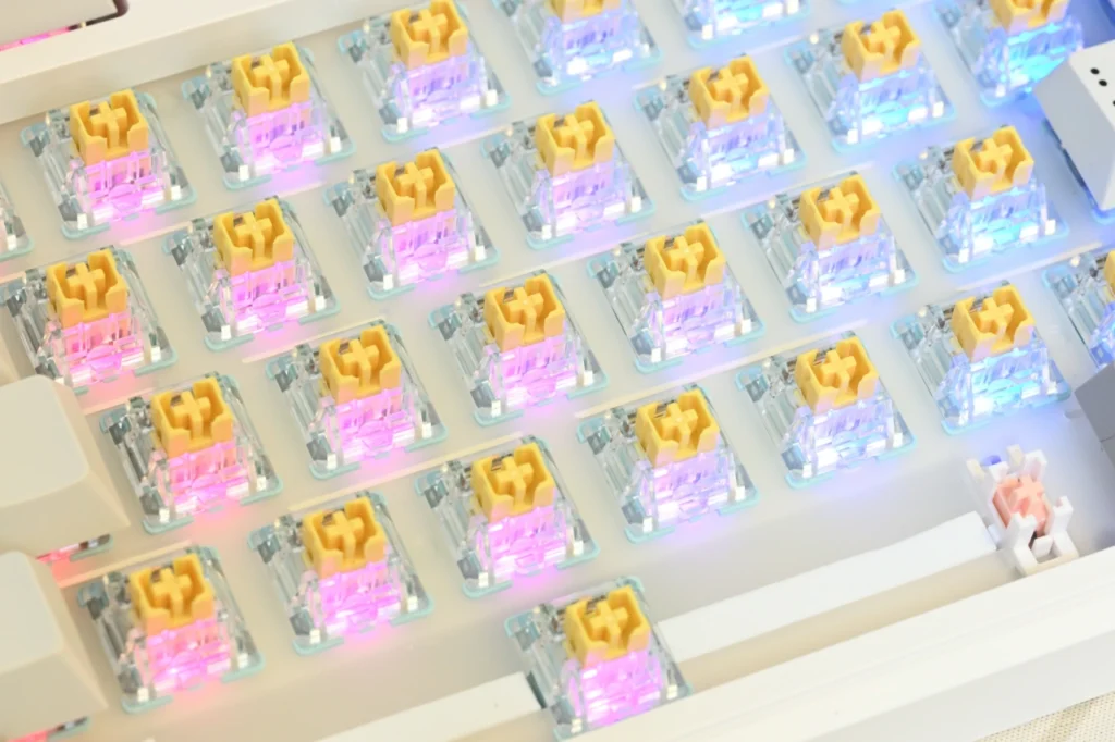 軸自体の静音性能も高いですが、EPOMAKER TH80 V2の5層吸音材とガスケットマウント、フレックスカットPCBといった筐体構造が加わることで、キーを底打ちした時の余計な響きをきれいに吸収してくれます。