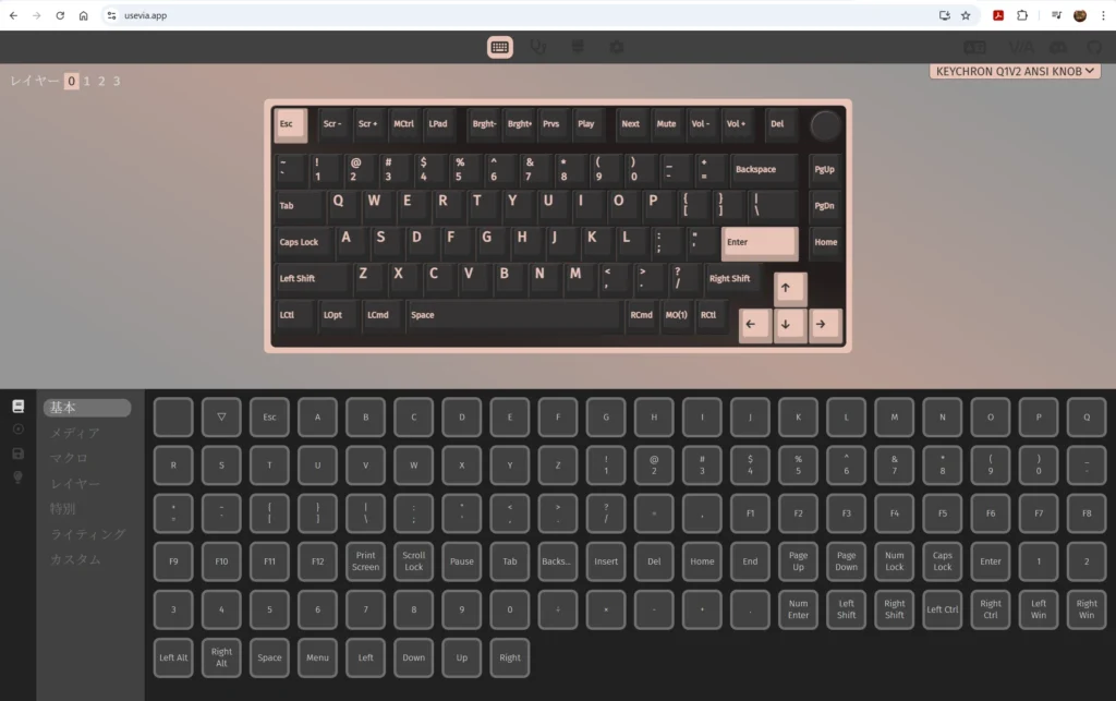 VIAを使えば、ブラウザ上でキーの割り当てを自由に変更できます。 現在はWindowsキーキャップが載っているため、Windowsモードで使用中。