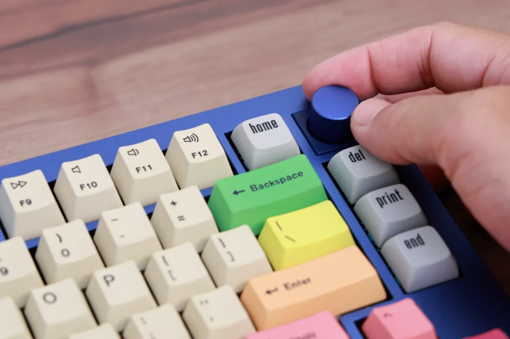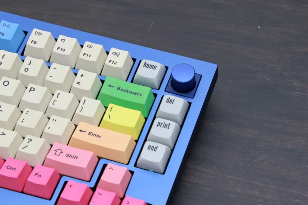 さらに、Enterキーの右側にもdel・homeキーとの間に余白が設けられています。 60%や一部の65%ではEnterキーの隣にすぐ別のキーが詰まっている配列もありますが、Q1ではEnterを押すときに隣のキーを巻き込むミスが起きにくい設計です。