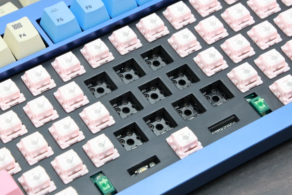 ピンクのハウジングが基板上にずらっと並ぶ見た目もかわいらしく、打鍵感もスムーズなリニアで気に入っています。