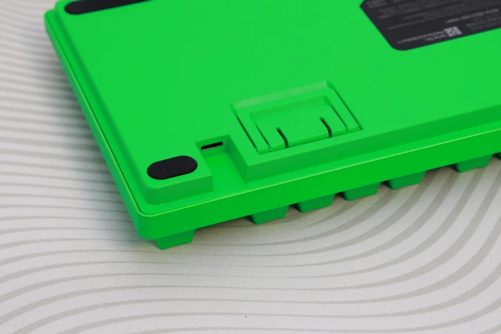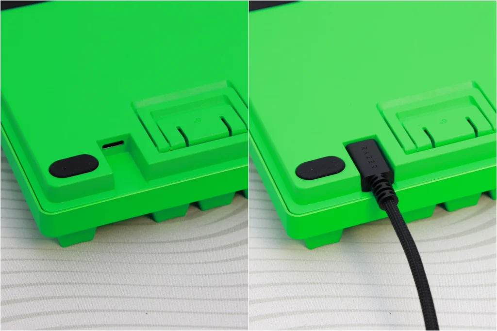 キーボード背面のUSB-Cポートは、周囲の筐体が狭めに設計されています。同梱のケーブルは問題なく挿さりますが、市販のUSB-Cケーブルだとコネクタ部分のハウジングが太くて入らない場合があります。