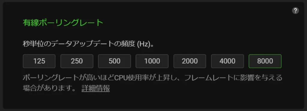 ポーリングレートを高く設定するとCPUへの負荷が上がります。キーボード単体であれば、キーを押している間だけデータが発生するため、常時センサーデータを送り続けるマウスほどの負荷にはなりません。