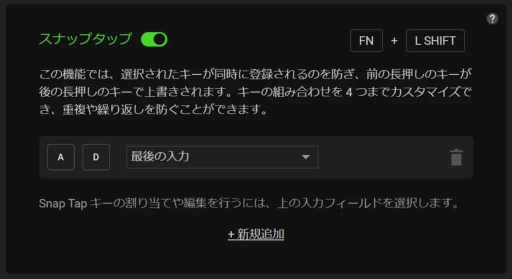 従来のキーボードでは、Aキー(左移動)を押しながらDキー(右移動)を押すと、両方が同時入力されてキャラクターが止まってしまいます。Snap Tapを有効にすると、後から押したDキーが自動で優先されるため、Aキーを離す動作を挟まずに即座に方向転換できます。