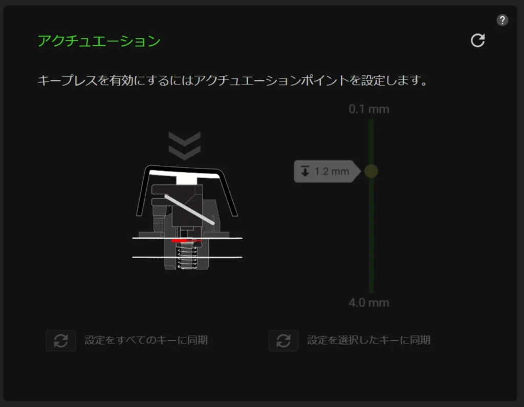 スライダーを動かして反応点を変え、実際にキーを押し込んで反応する深さを確かめる。この一連の操作が視覚的にわかりやすく、設定作業そのものが楽しい体験です。