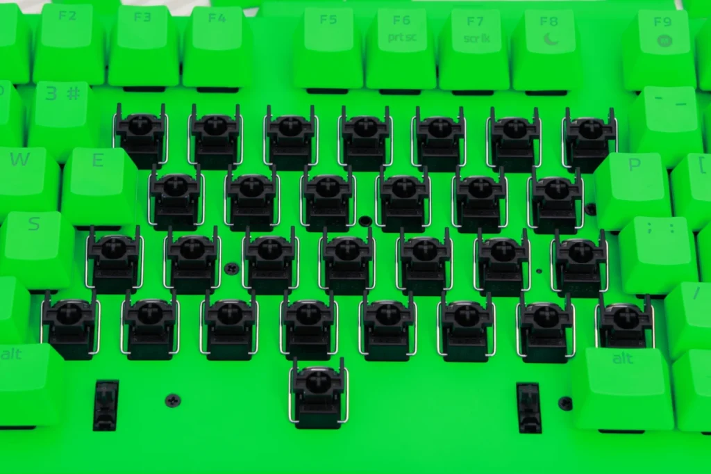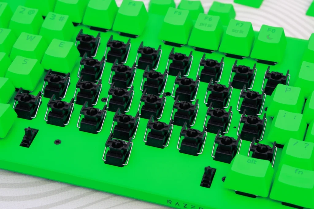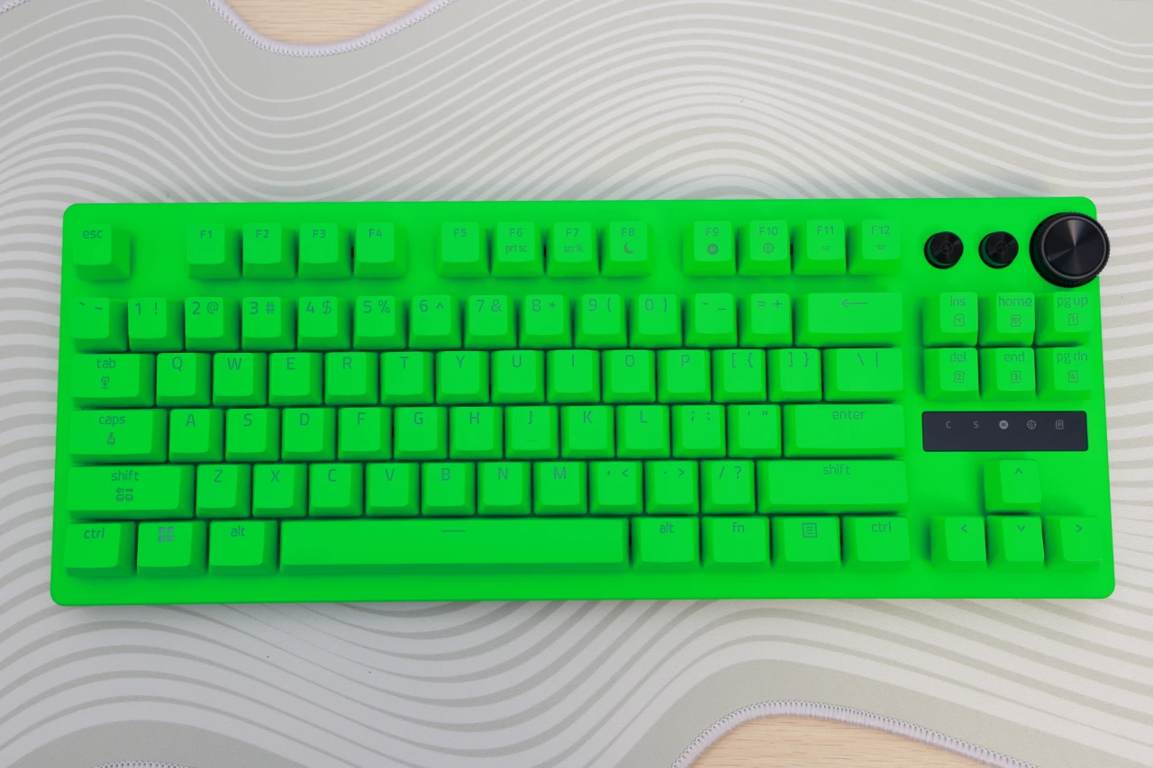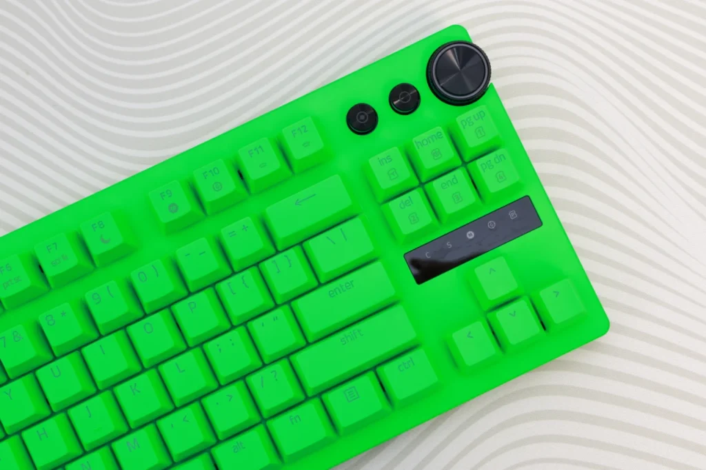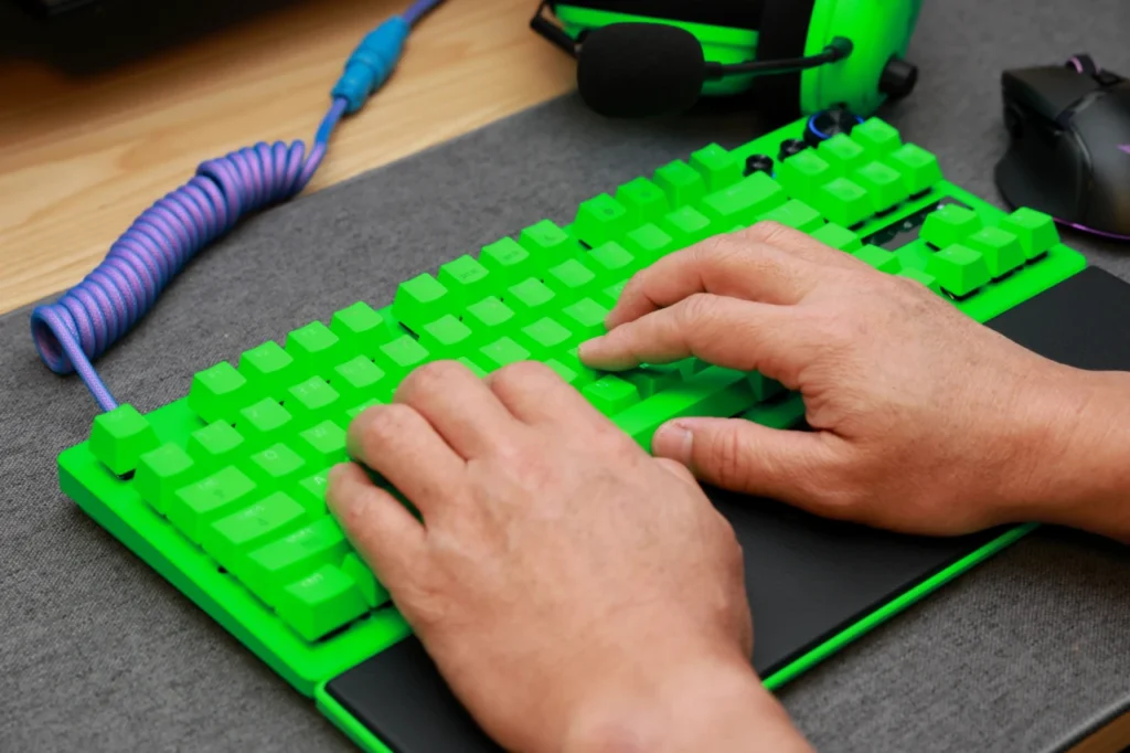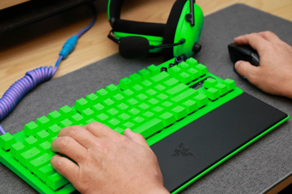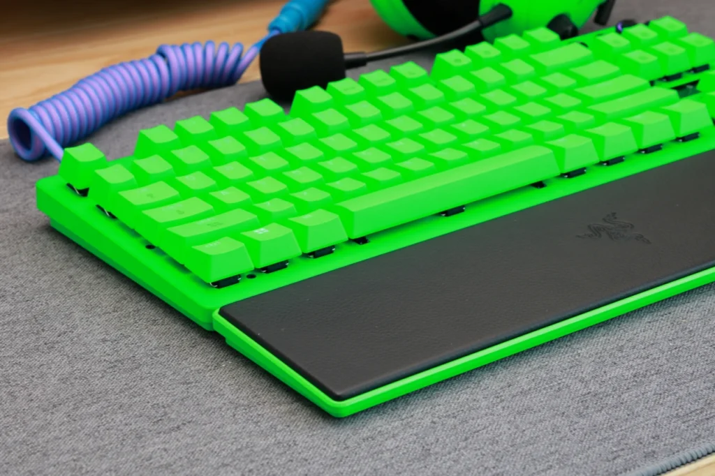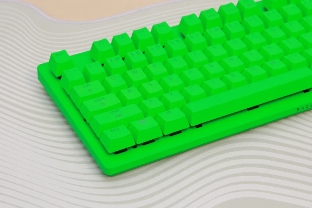Esports Green Editionは、キーボード全体がRazerのブランドカラーであるグリーンで統一されています。キーキャップ、ケース、トッププレートのすべてがグリーンで、一目で「Razerのキーボードだ」とわかるインパクトがあります。