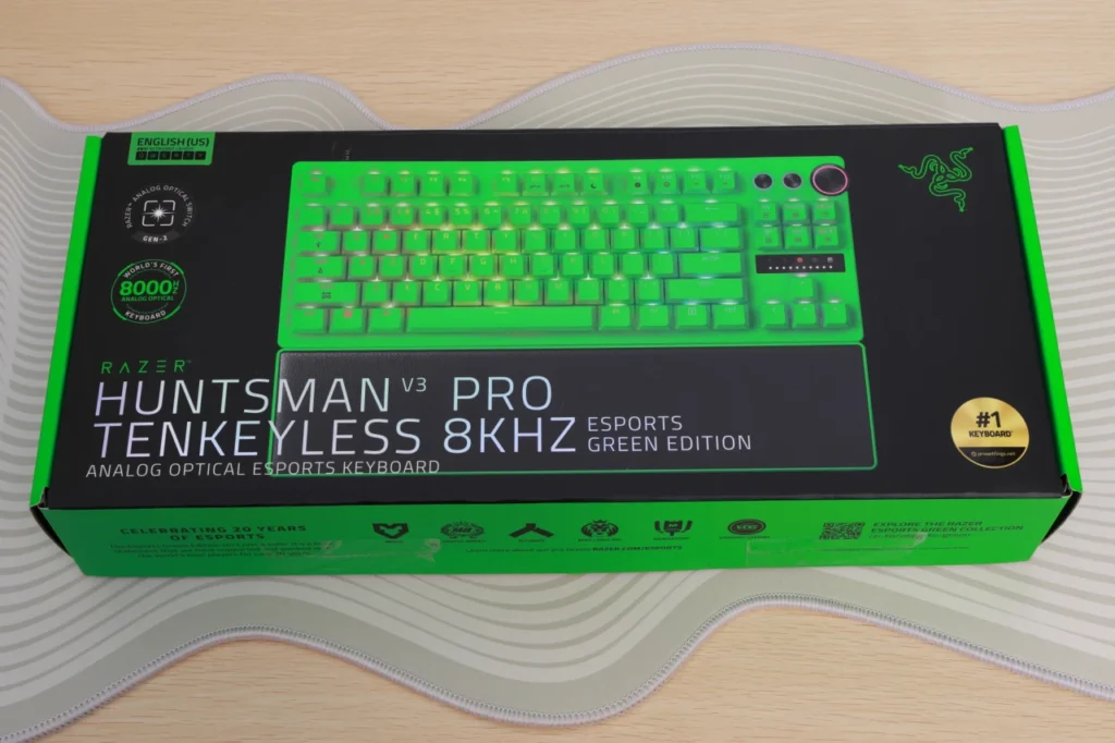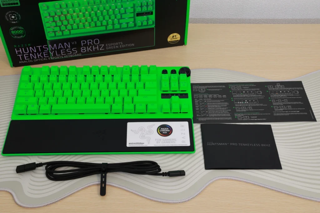 まずは、Razer Huntsman V3 Pro Tenkeyless 8KHzのスペックやデザイン、付属品について紹介していきます。