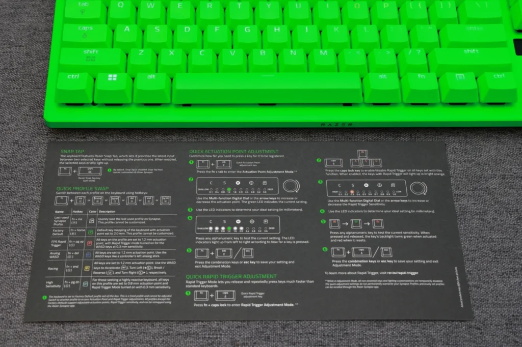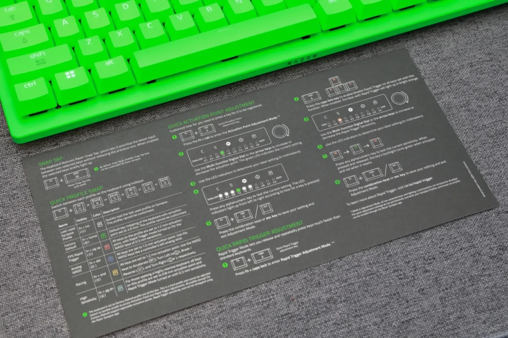付属のクイックガイドには、プロファイル切り替え・アクチュエーション調整・ラピッドトリガー調整・Snap Tapのショートカットが一覧でまとめられています。操作に慣れるまでは、キーボードの横に置いておくと便利です。