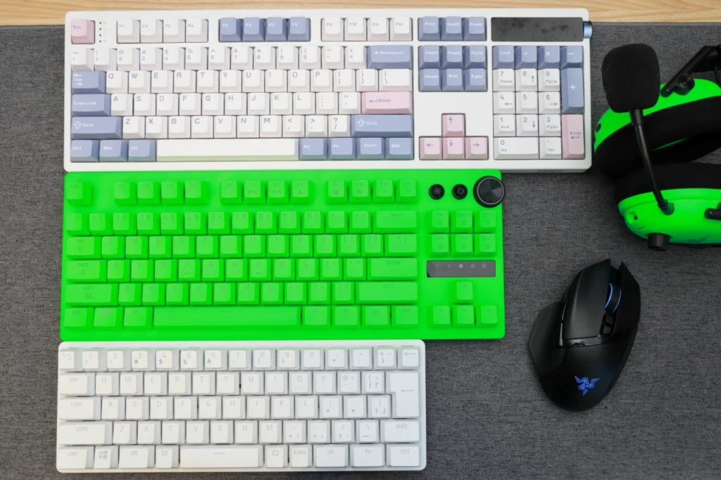 フルサイズ、テンキーレス、60%キーボードを並べてみると、テンキーレスはナビゲーションキー群を残しつつ、フルサイズから数字パッド分をカットしたサイズ感です。マウスの操作スペースを確保しつつ、矢印キーやInsert/Deleteキーが使えるバランスの良いレイアウトだと言えます。