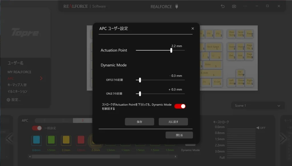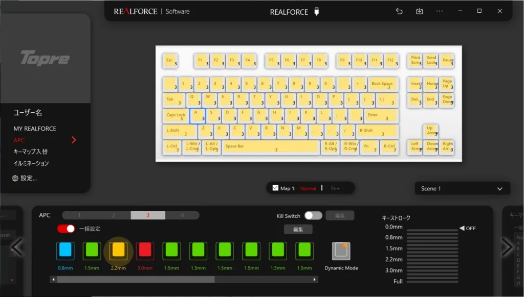 30gの軽さゆえにタイプミスが気になるなら、APCの設定で対策できます。 私の場合、APCを2.2mmに設定しています。 一括設定で全キーを2.2mmにすることで、浅い位置での誤入力を防いでいます。