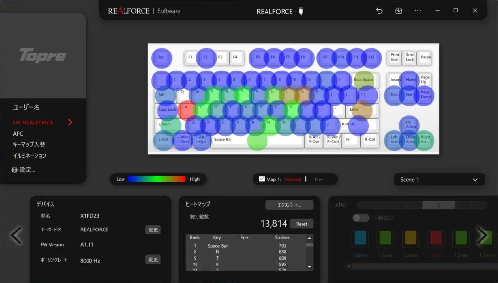 REALFORCE CONNECTには「ヒートマップ」という機能があります。 これは自分がどのキーをどれだけ打鍵しているかを、色分けで視覚的に確認できるツールです。