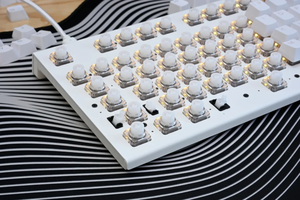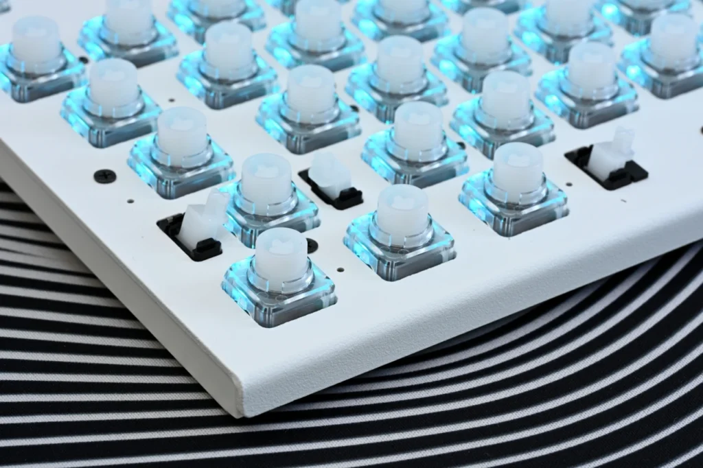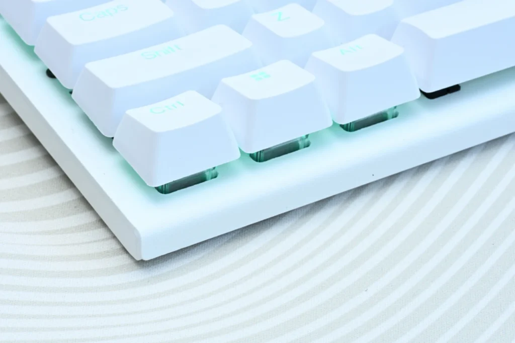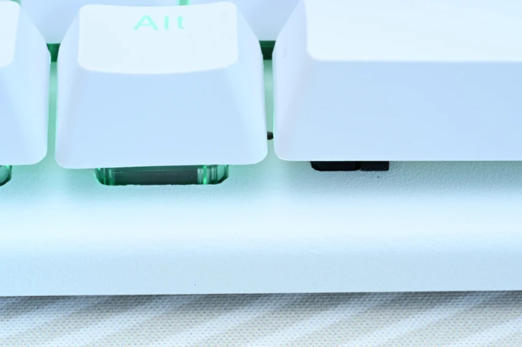 フローティングデザインのおかげで、スイッチの周りからぼわっと光がこぼれます。 この柔らかな光の広がりと、キーキャップの透明部分から映し出される鮮明な色のコントラストが見事。 白い筐体だからこそ、光の表現がより際立ちます。