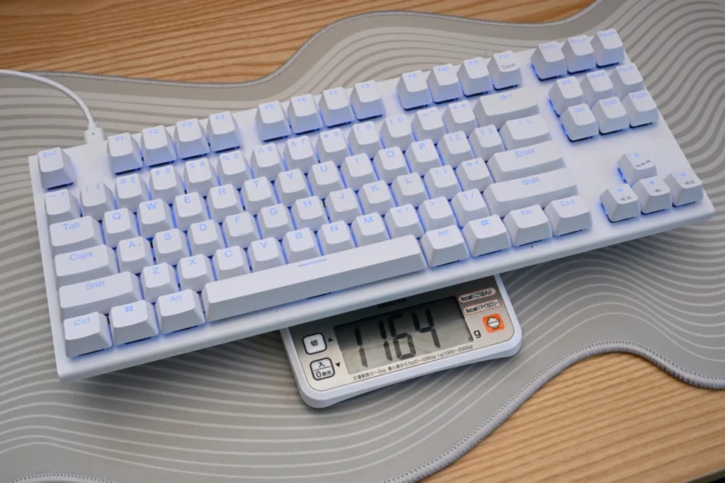 本体重量は公称約1.2kg、実測でも1,165gと、TKLキーボードとしてはかなり重量級です。 デスク上での安定感には貢献しますが、カバンに入れて持ち運ぶには現実的な重さではありません。