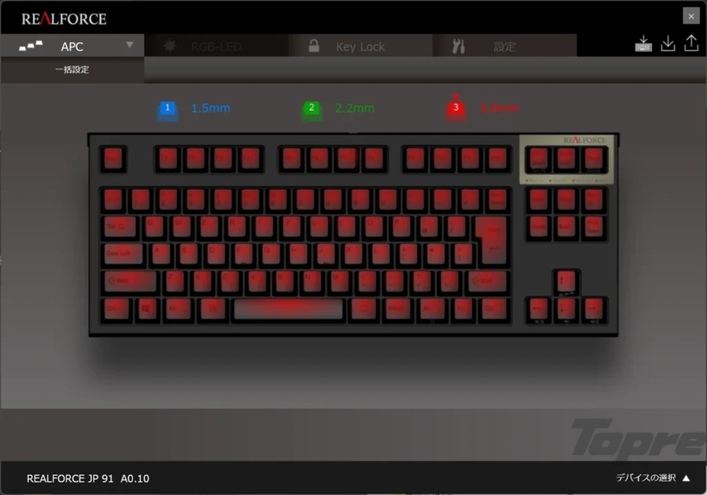APC(アクチュエーションポイントチェンジャー)というのは、キーを押したときに入力が認識される深さを変更できる機能のこと。