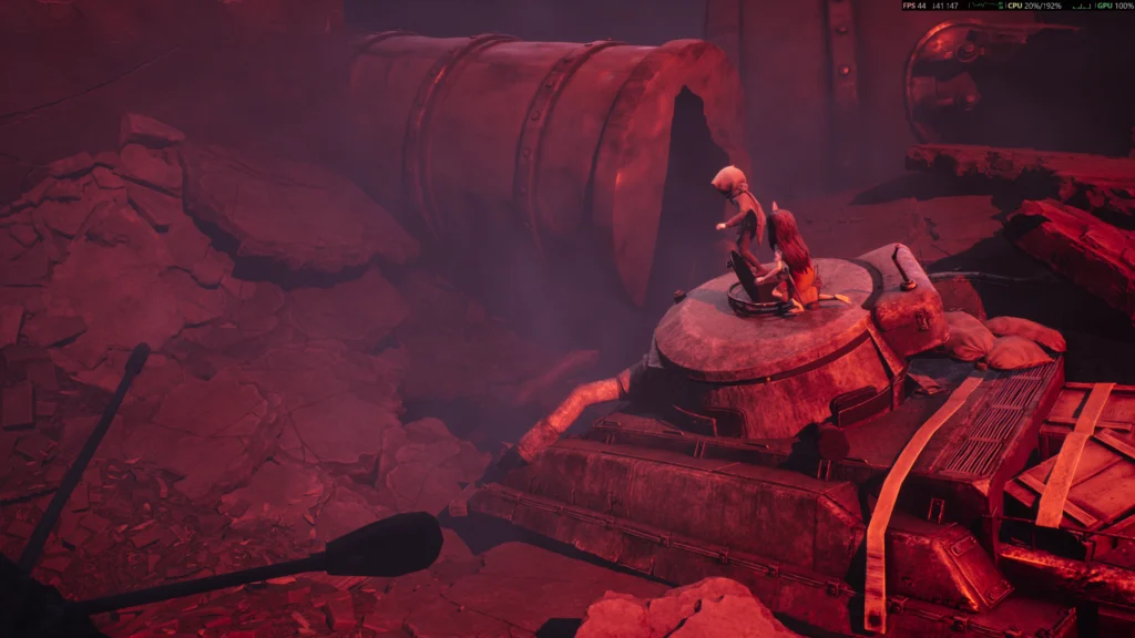 REANIMALはホラーゲームながら、グラフィックの作り込みが非常に細かい作品です。赤一色に染まった荒廃した雪原、青い光が差し込む水没したトンネルなど、シーンごとに印象的なカラーパレットが使われています。