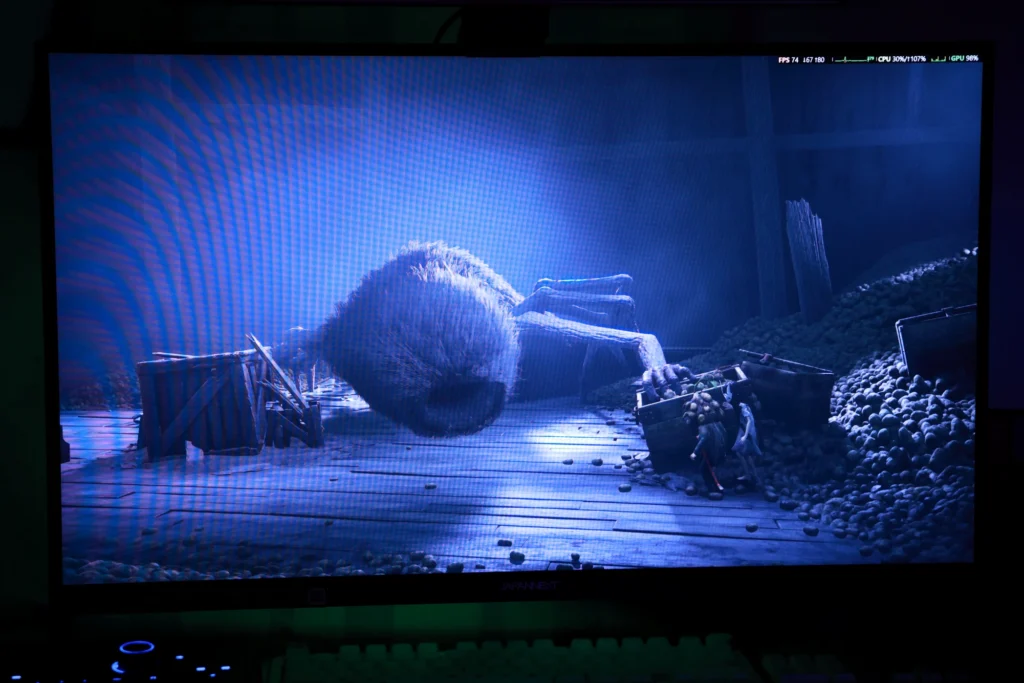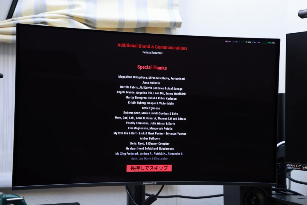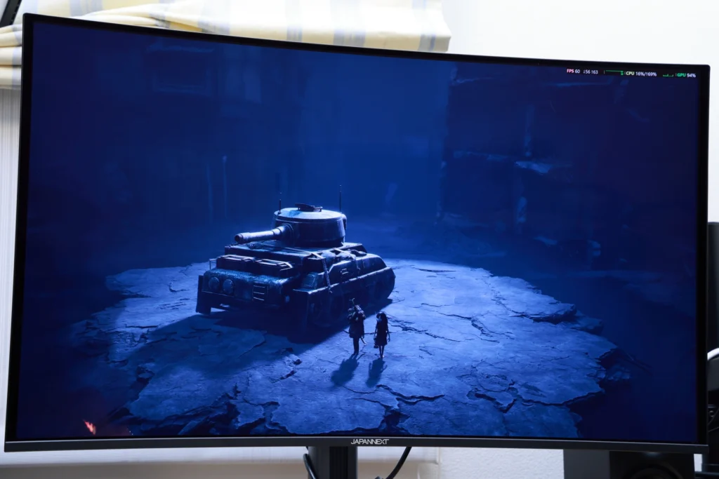 そして、JN-QOLC315G240U-HSC6のようなQD-OLEDモニターとの組み合わせは、このゲームの魅力をさらに引き上げます。漆黒の表現・湾曲による没入感・広色域の発色、これらすべてがホラーゲームのグラフィックと高い親和性を持っています。IPSモニターと並べて比較すると、タイトル画面の時点から違いが明らかで、プレイ中の体験差はさらに大きく感じられます。