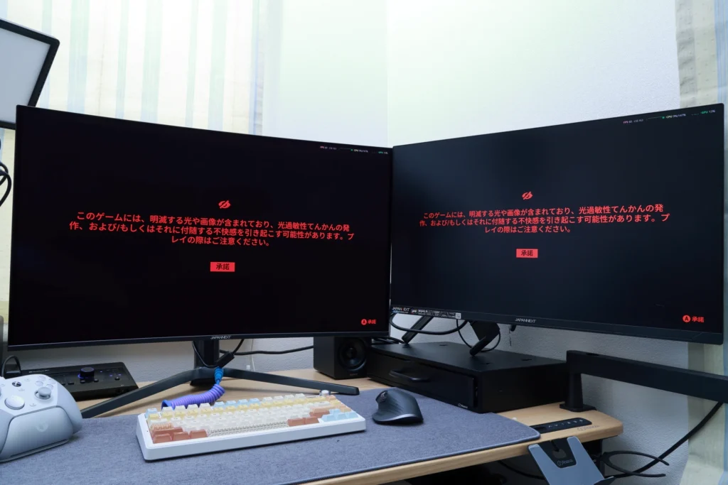 また、今回は、手元にあるJAPANNEXTのIPSモニター「JN-IPS27G300Q-HSP」と並べて比較しながらプレイしました。同じJAPANNEXTのモニターでも、パネルの種類やサイズが異なると、ゲーム体験にどれほどの差が生まれるのかを実際に確かめています。