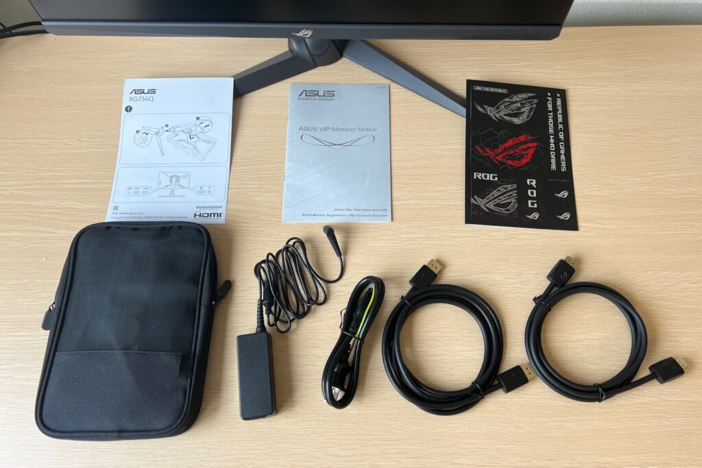 付属品は、充実しています。モニタースタンドだけでなく、HDMIケーブルとDisplayPortケーブルが付属するのが嬉しいところです。ケーブルは別売りというモニターが案外多いですが、初ゲーミングモニターの場合はケーブルを持っていない方もいます。