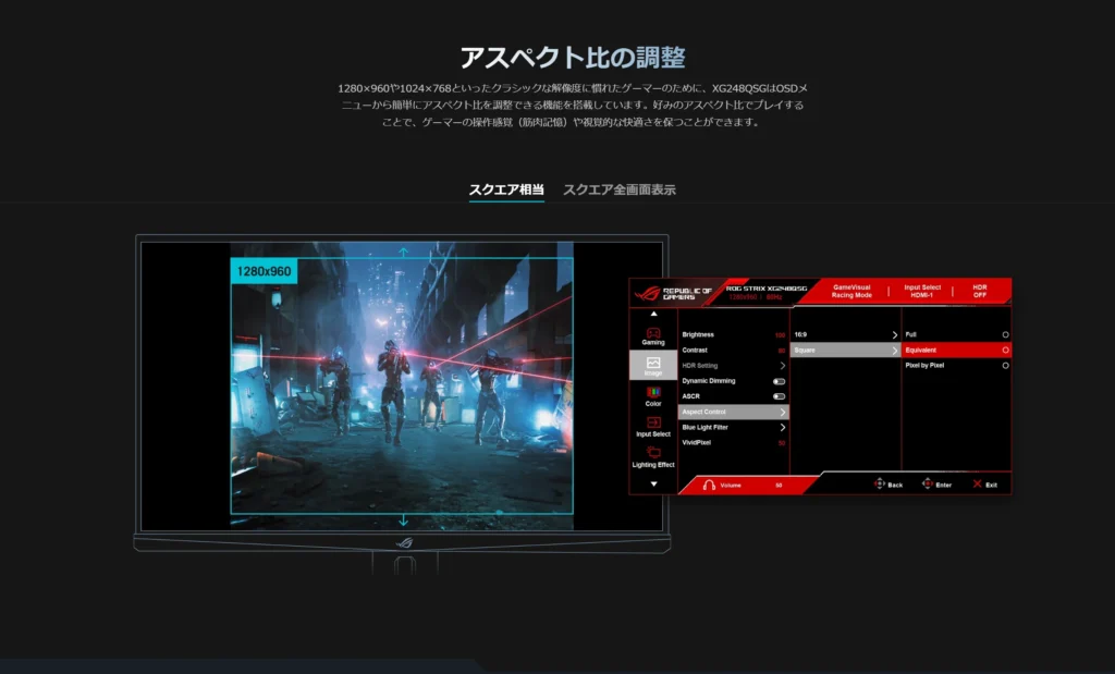 ROG Strix XG248QSG Aceは、アスペクト比を調整できます。