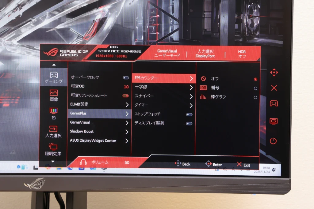 ROG Strix XG248QSG Aceには、ゲーム向けの機能が一通り揃っています。