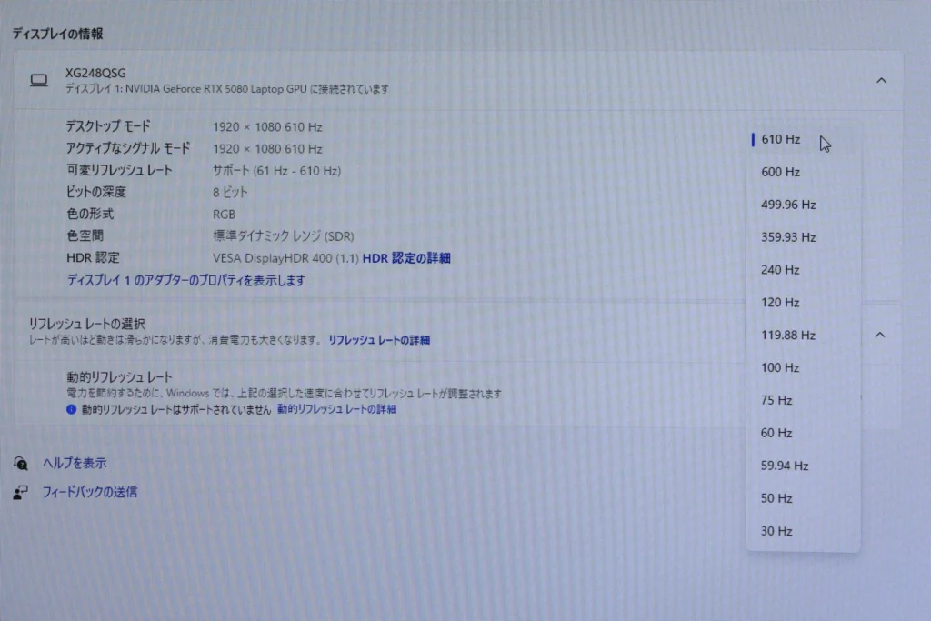 それでも、610Hzという最大リフレッシュレートには届かない可能性が高いです。フレームレートの制限がないようなタイトルでも、フルHDでそれほどのリフレッシュレートには基本的にはなりません。