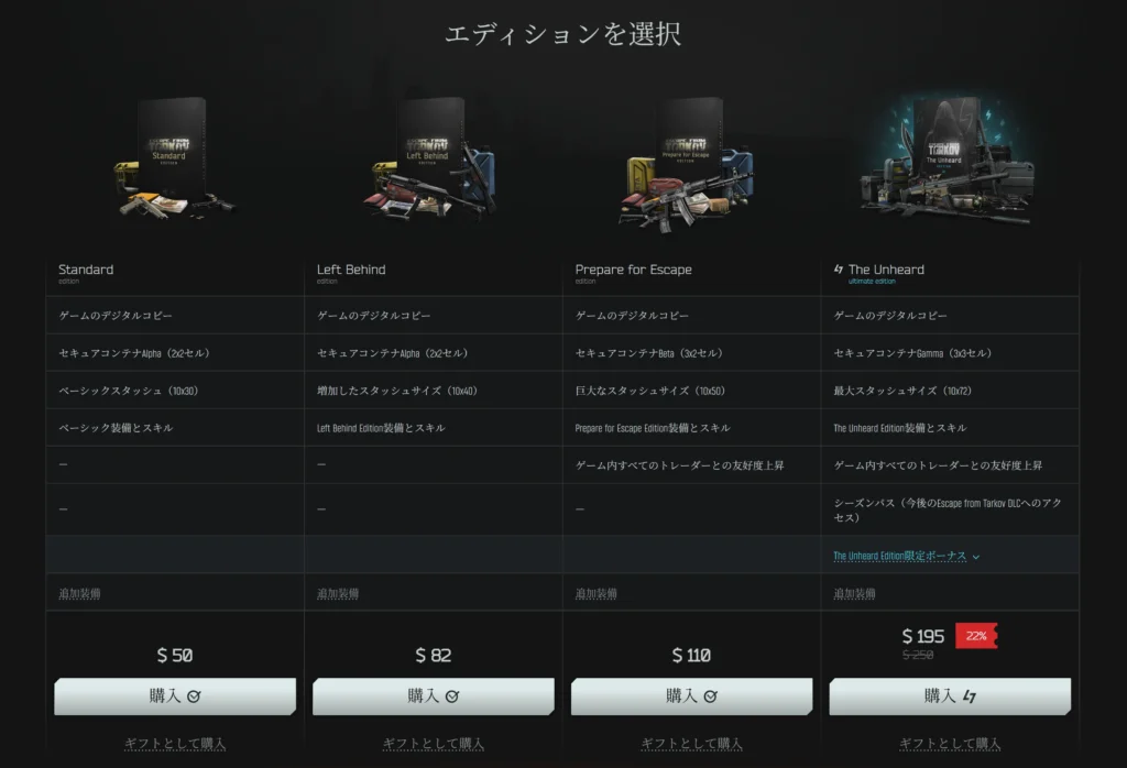 タルコフの購入価格は、一番安いパッケージで44.99$、そこから内容によって価格があがり、74.99$、99.99$、一番高いもので139.99$になります。