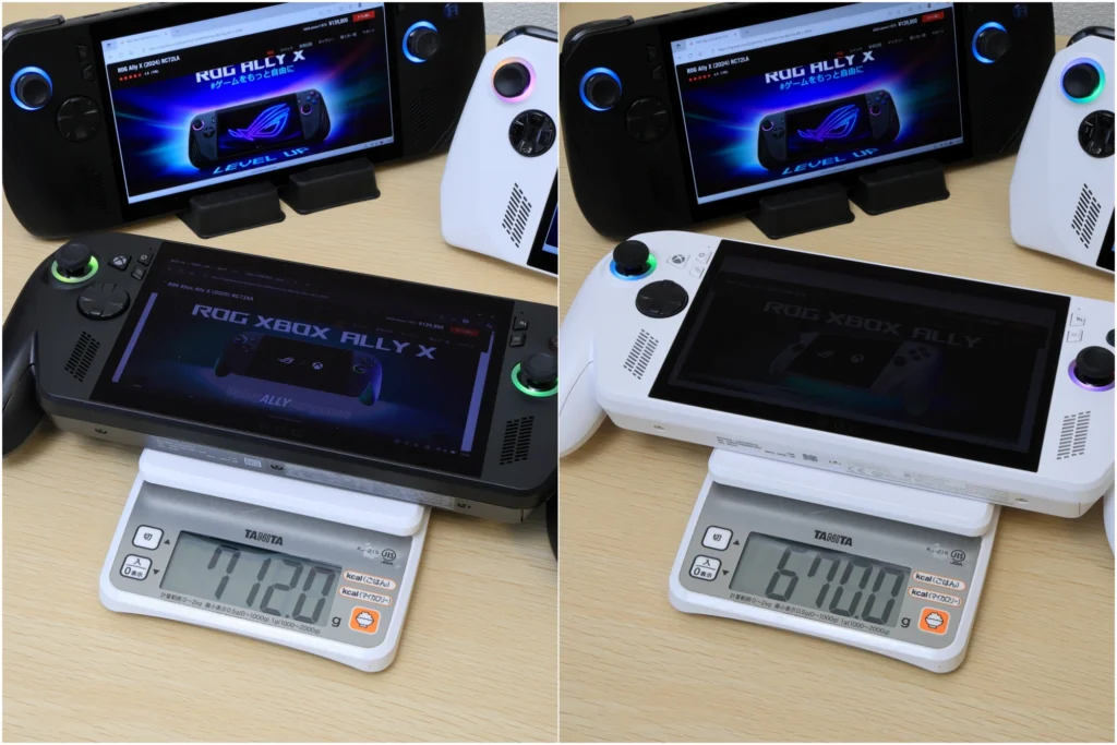 重量は、ROG Xbox Ally Xが715g、ROG Xbox Allyが670gと、45gの違いがあります。