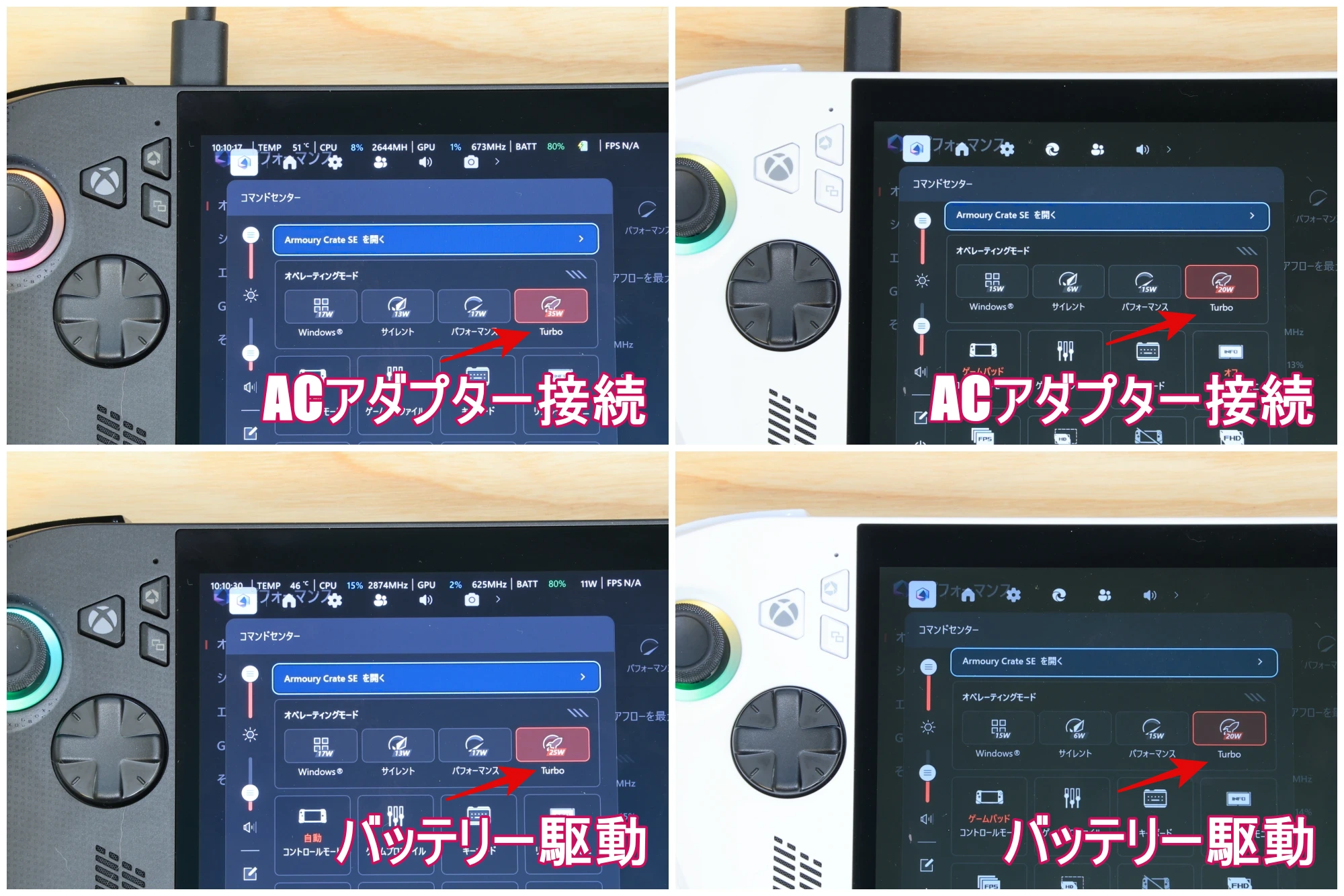 左がROG Xbox Ally X、右がROG Xbox Ally(無印)。Ally XはACアダプターを接続すると最大35W、バッテリー駆動では25W。一方で無印モデルは、AC接続時も20W固定となっています。