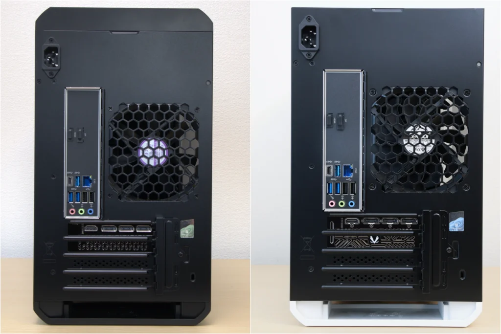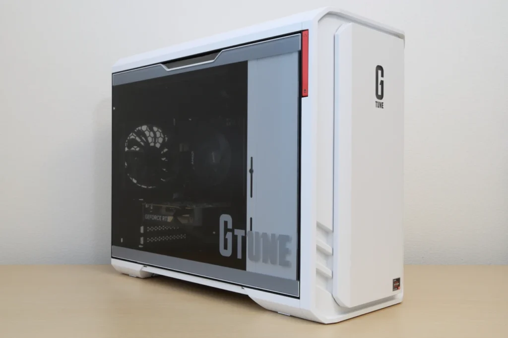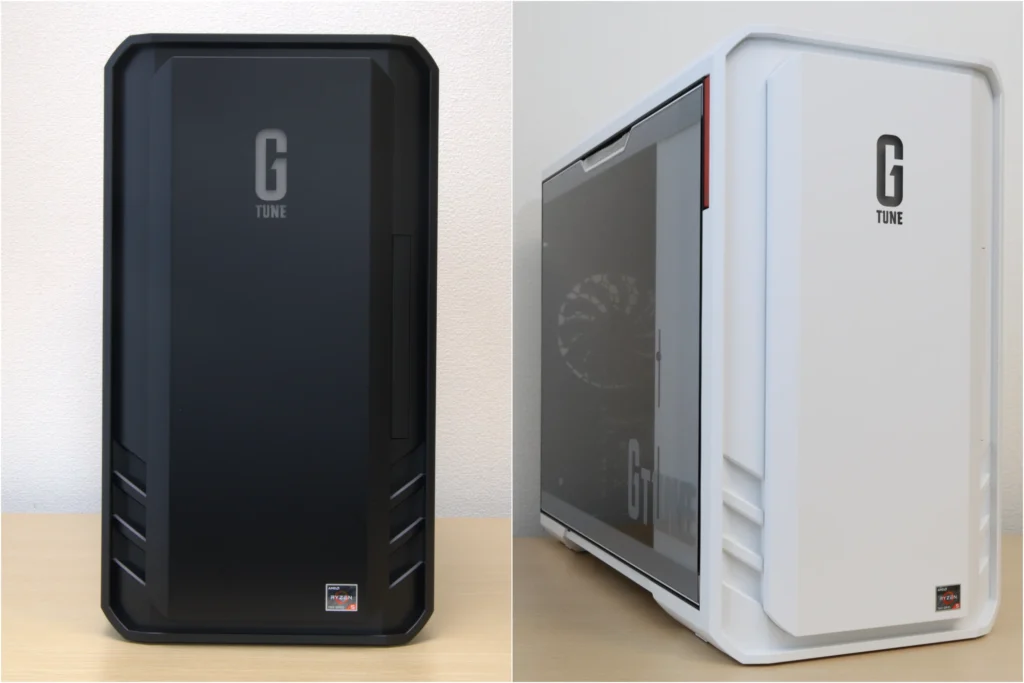 ホワイトモデルは清潔感があり、デスク上に置いても部屋の雰囲気を崩しません。 ブラックモデルは引き締まった印象で、ゲーミング環境に馴染むカラーリングです。 どちらもフロントパネルにG TUNEのロゴが大きくあしらわれており、ゲーミングPCらしいデザインに仕上がっています。