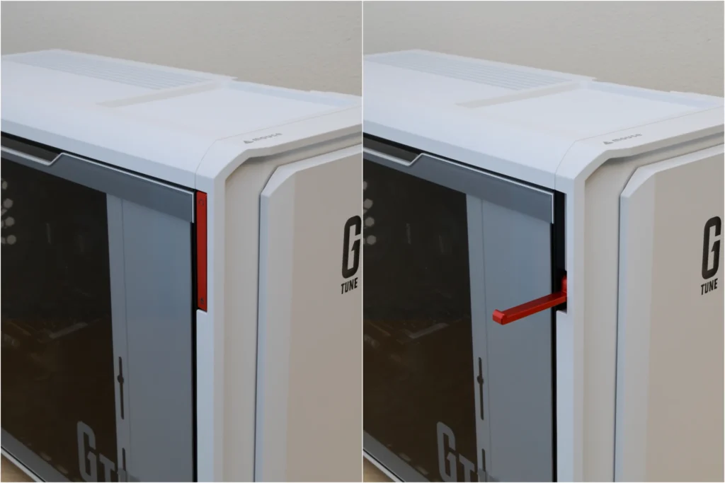 ガラスサイドパネルは、上部の赤色ラッチを引っ張ることで簡単に開閉可能。 ドライバーを使ったりマザーボードを引き出したりせずに、内部の掃除やパーツ交換ができます。