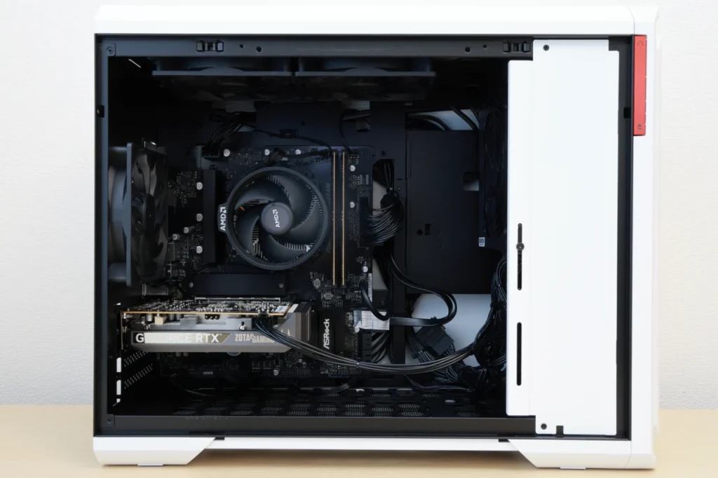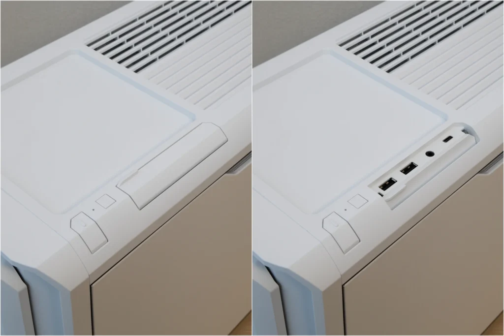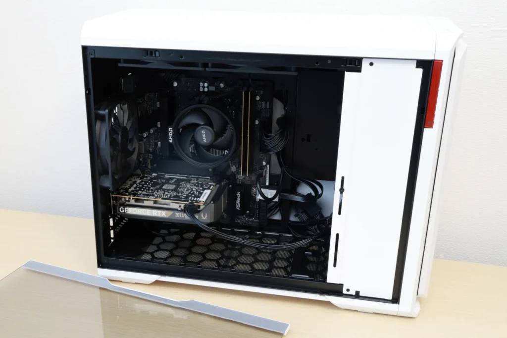 ケースのデザイン性と機能性を両立している点も見逃せません。 ブラックとホワイトの2カラー展開で好みに合わせて選べるうえ、ツールレスでサイドパネルが開くメンテナンス性、ヘッドホンホルダーやスライドカバー付きI/Oなど、実用性もしっかり考えられています。
