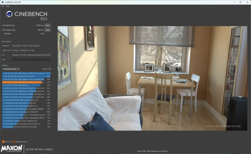 最大スレッド数で5,983、シングルスレッドで995というスコア。 Ryzen 5 7500Fとしては標準的な結果で、ゲーム中にCPUが足を引っ張ることはほぼないでしょう。