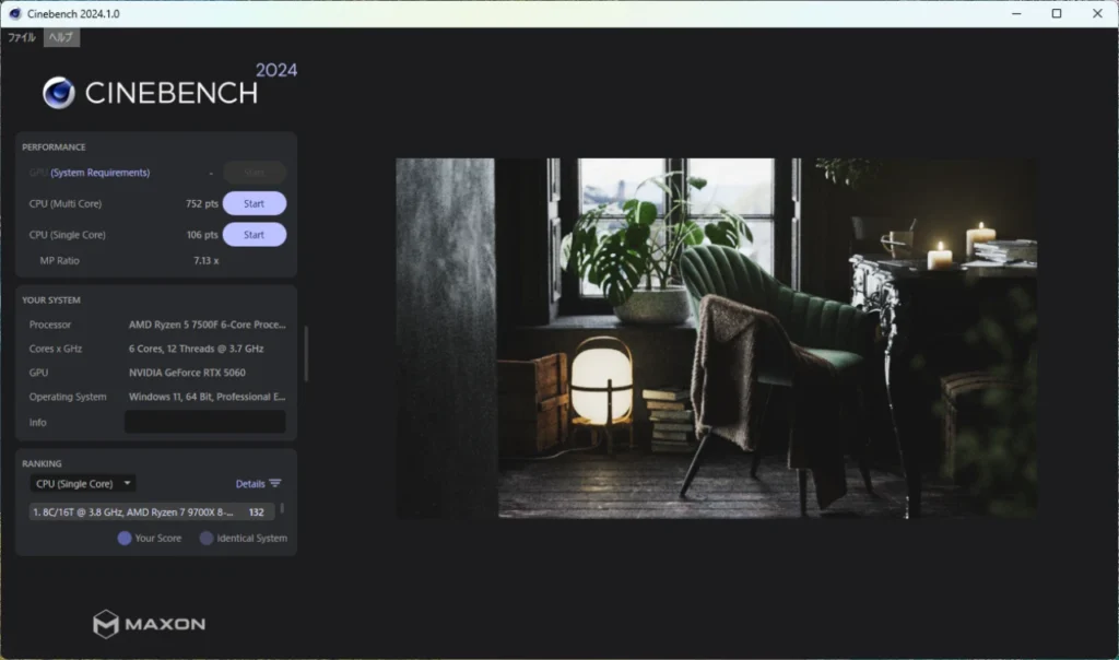 Cinebench 2024では、マルチコアが752pts、シングルコアが106ptsという結果。 こちらもRyzen 5 7500Fの期待値通りの数値です。ゲーム用途であれば十分な性能があり、RTX 5060のGPU性能を引き出すには申し分ないCPUパワーだと言えます。