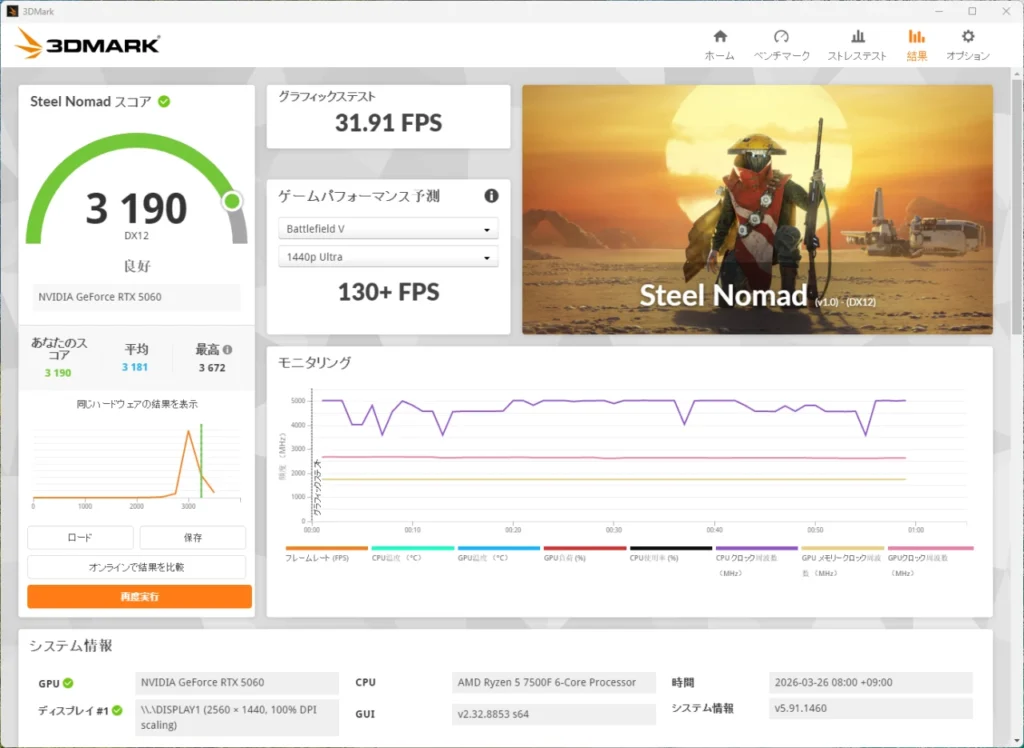 Steel Nomadは、DirectX 12ベースの高負荷GPUテスト。最新のAAAタイトルに近い描画負荷をかけて、GPU単体の処理能力を測定します。スコアは3,190で、評価は「良好」。重量級のゲームでもフルHD環境なら十分対応できる性能を示しています。