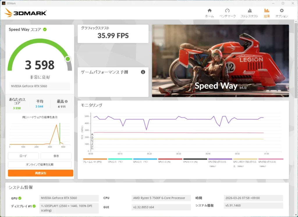Speed Wayは、レイトレーシングを使った高負荷テスト。レイトレーシングというのは、光の反射や屈折をリアルに再現する描画技術のことです。スコアは3,598で、「非常に良好」の評価を獲得しました。レイトレーシング対応のゲームでも、フルHD環境であれば快適にプレイできる水準です。