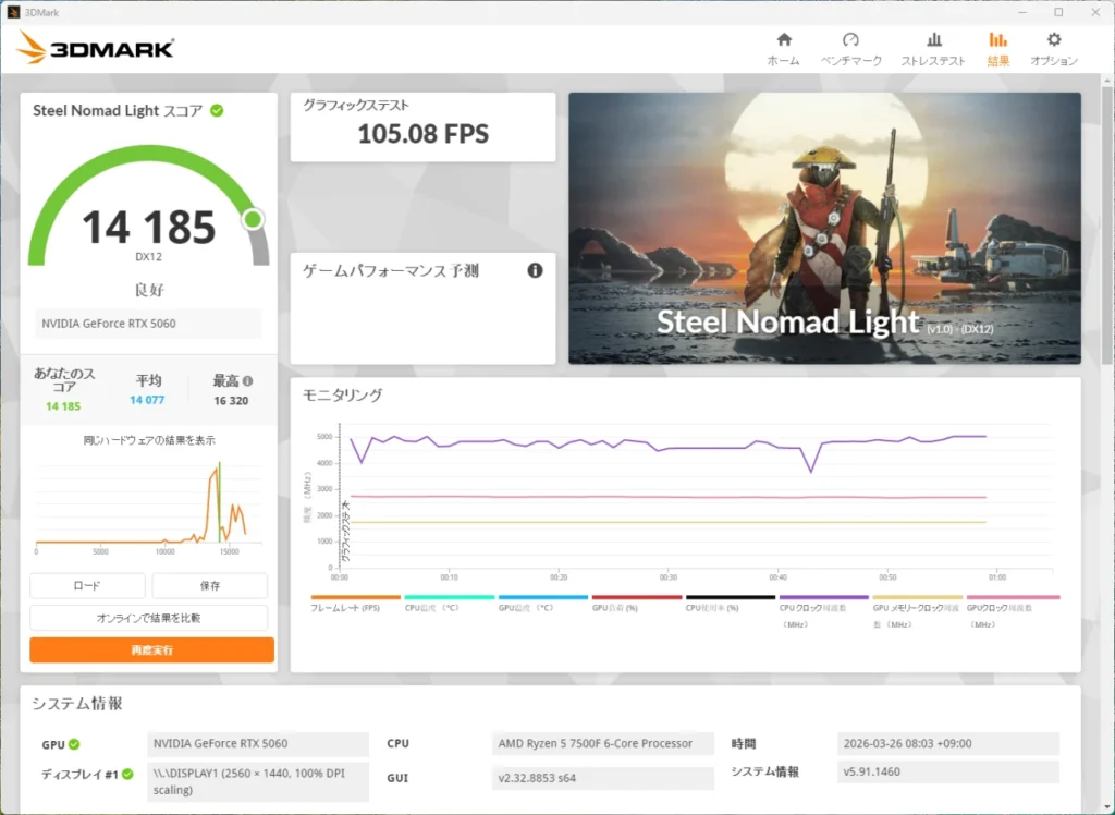 Steel Nomad Lightは、Steel Nomadの軽量版テスト。一般的なゲームに近い描画負荷で計測するため、日常的なゲームプレイに近い性能がわかります。スコアは14,185で、グラフィックステストでは105.08 FPSを記録しました。軽量〜中程度のゲームであれば、高画質設定でも余裕を持って動作できることが確認できます。