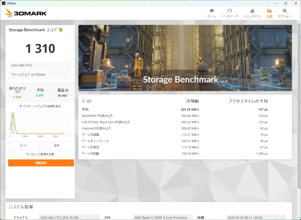 搭載SSDはSLEG-860-1TCS(1TB)で、スコアは1,310。 平均帯域幅は224.29 MB/s、アクセスタイムの平均は137μsという結果です。