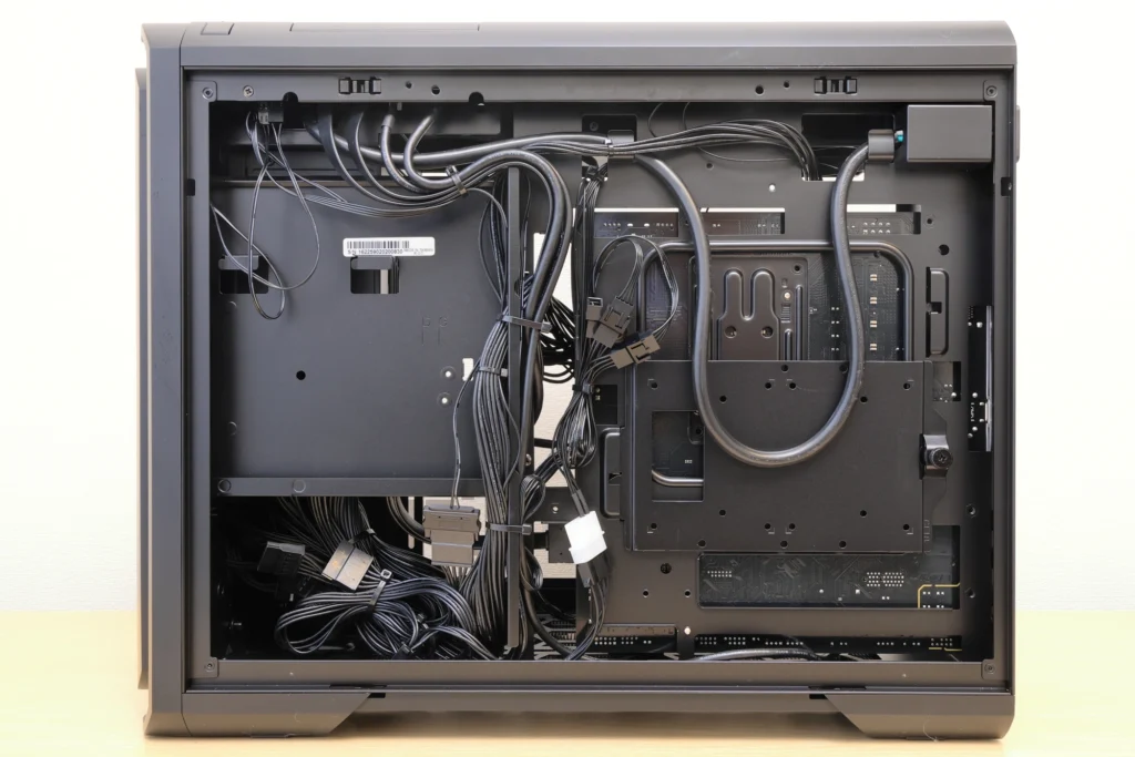 右側面はメタルパネルで覆われた仕様。 裏配線スペースも確保されており、ケーブル類がすっきりまとめられています。