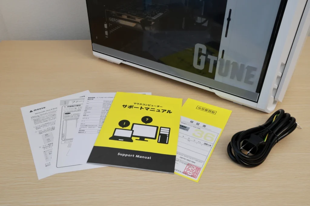 同梱品は、電源ケーブルとサポートマニュアル、保証書、Minecraftのインストールガイドなど。 マウスやキーボード、モニターは付属しないため、別途用意が必要です。