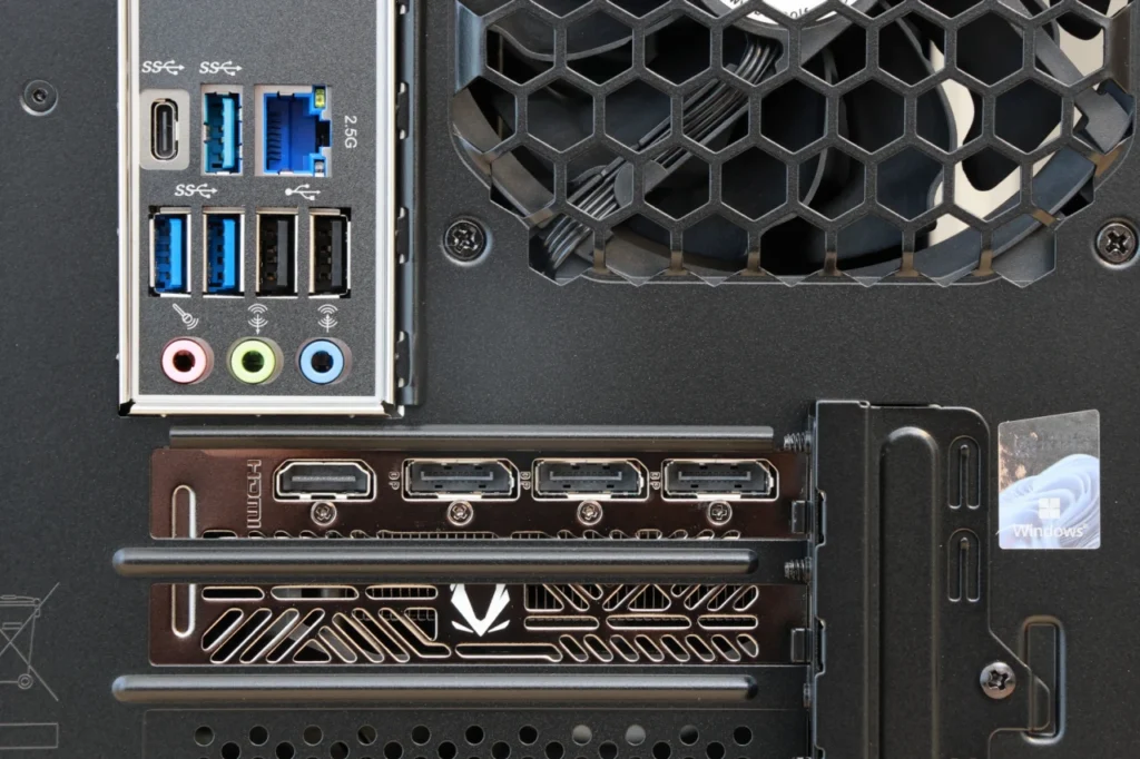 GPU側にはHDMI×1、DisplayPort×3の映像出力端子が搭載されており、最大4画面のマルチモニター環境にも対応可能。