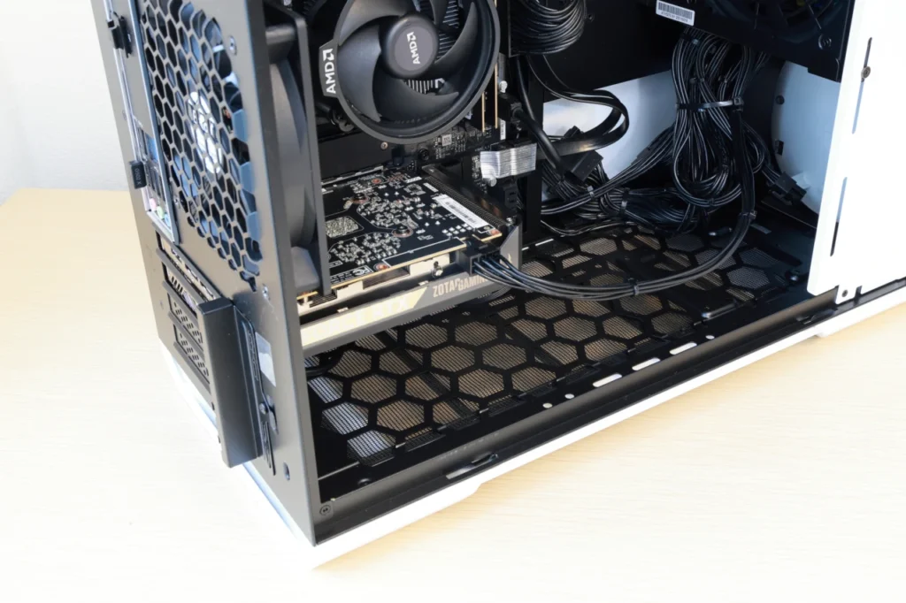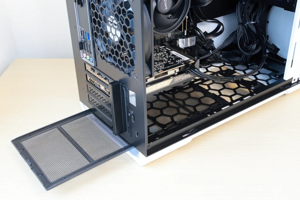 冷却性能の面では、フルタワーのグリル型フロントパネルのほうが吸気効率は高いです。 ただ、フルタワーはより発熱しやすい高性能なパーツを搭載しているからこそ、その冷却設計が必要になっています。 G TUNE DG-A5G60のパーツ構成であれば、ミニタワーの冷却性能でも問題ありません。